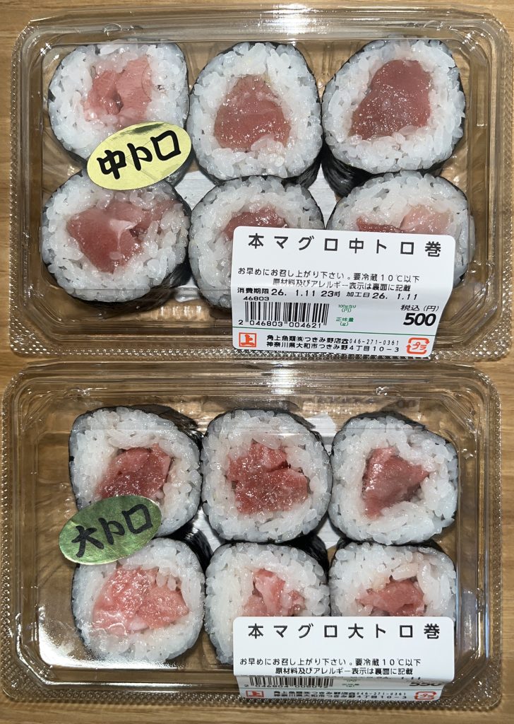 上 本マグロ中トロ巻 税込500円  下 本マグロ大トロ巻 税込550円