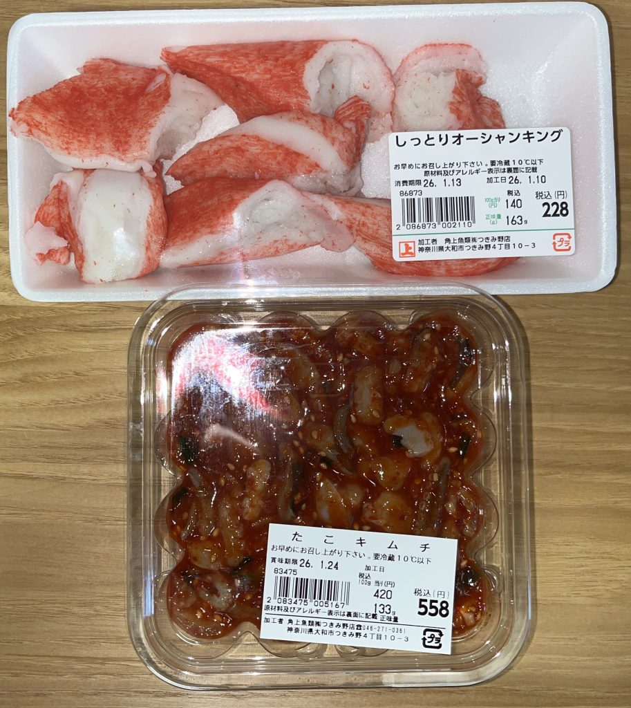 上 しっとりオーシャンキング 税込228円  下 たこキムチ 税込558円