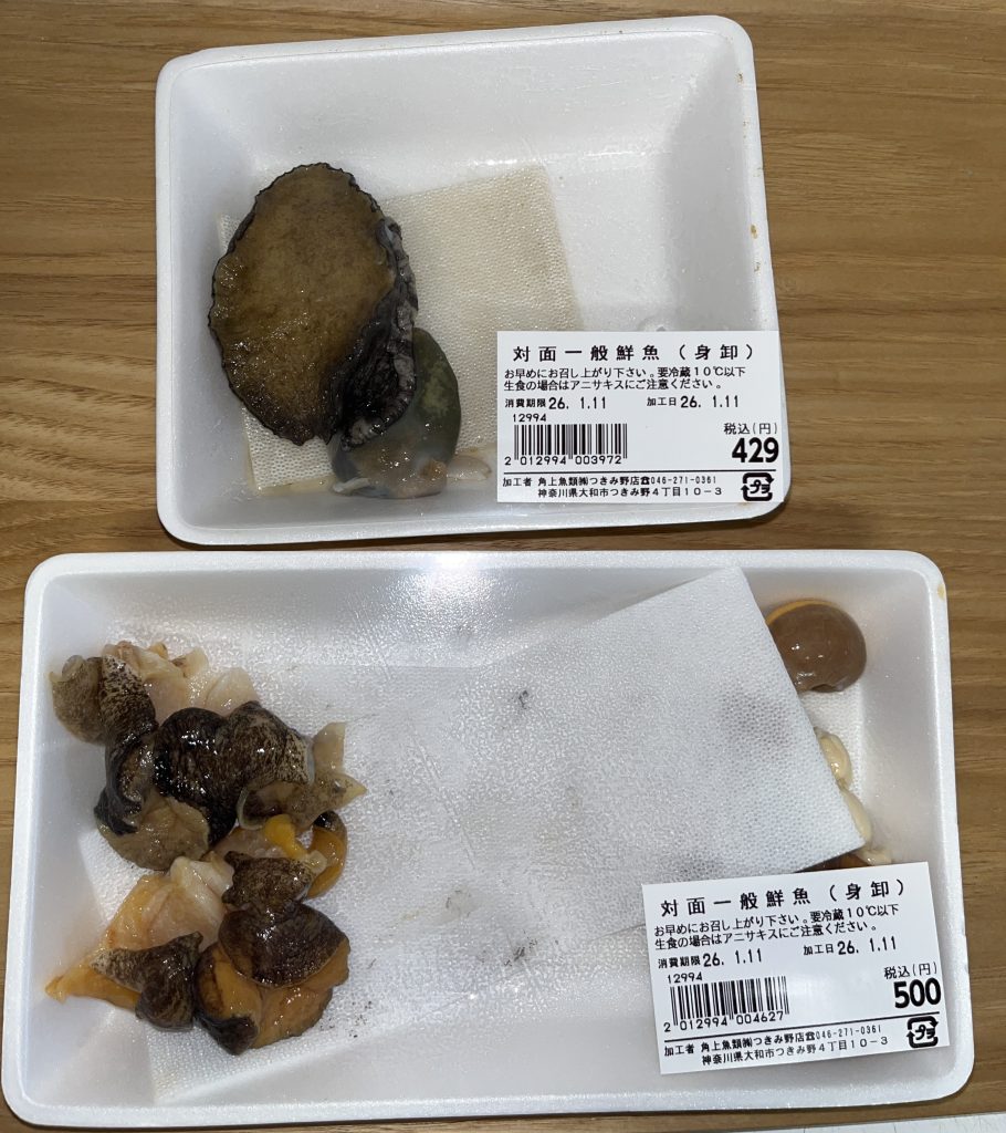 上 アワビ 税込429円  下 つぶ貝2個分 税込500円