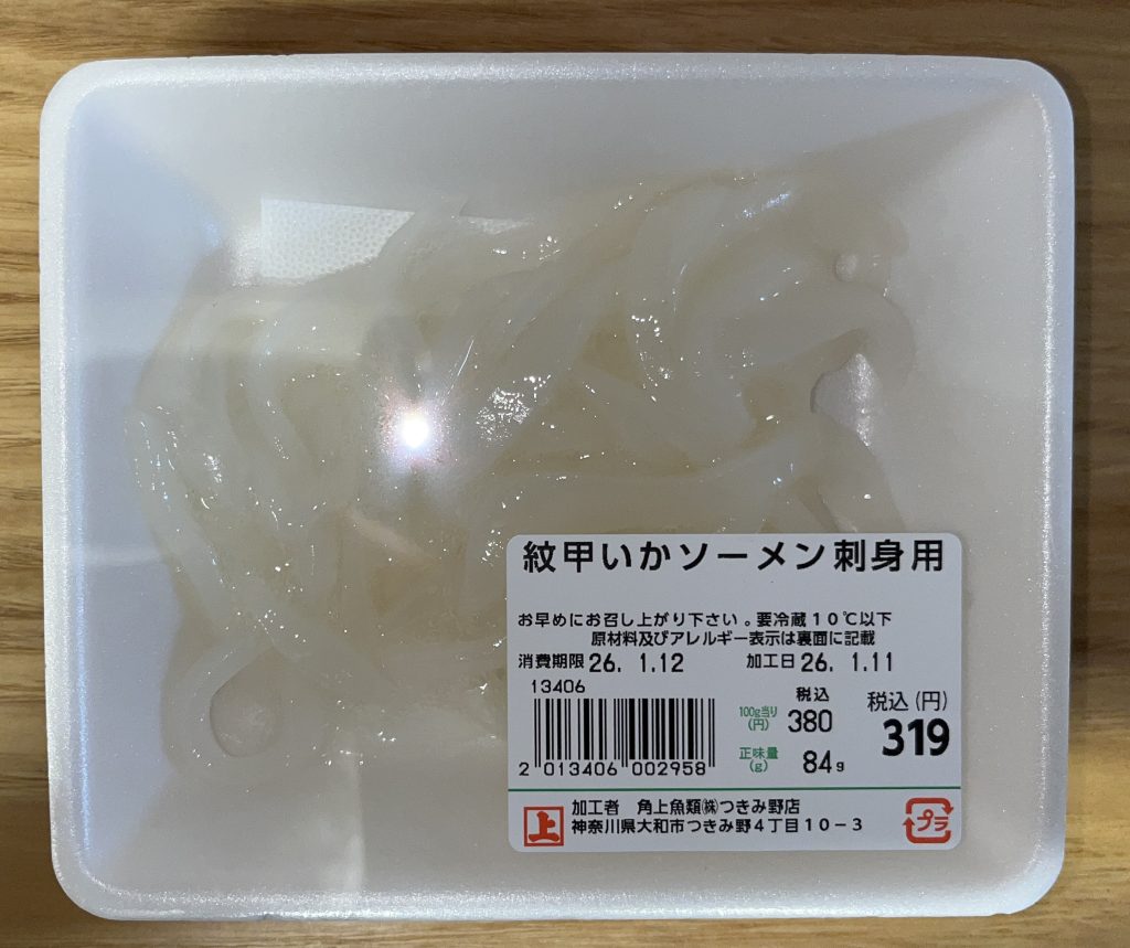 対面販売で紋甲イカが1杯2000円弱で有り欲しかったのですが、他も色々購入するには多すぎると思い、こちらの刺身用で販売されていた少量品を購入。