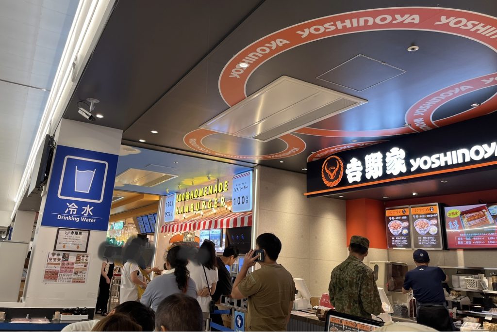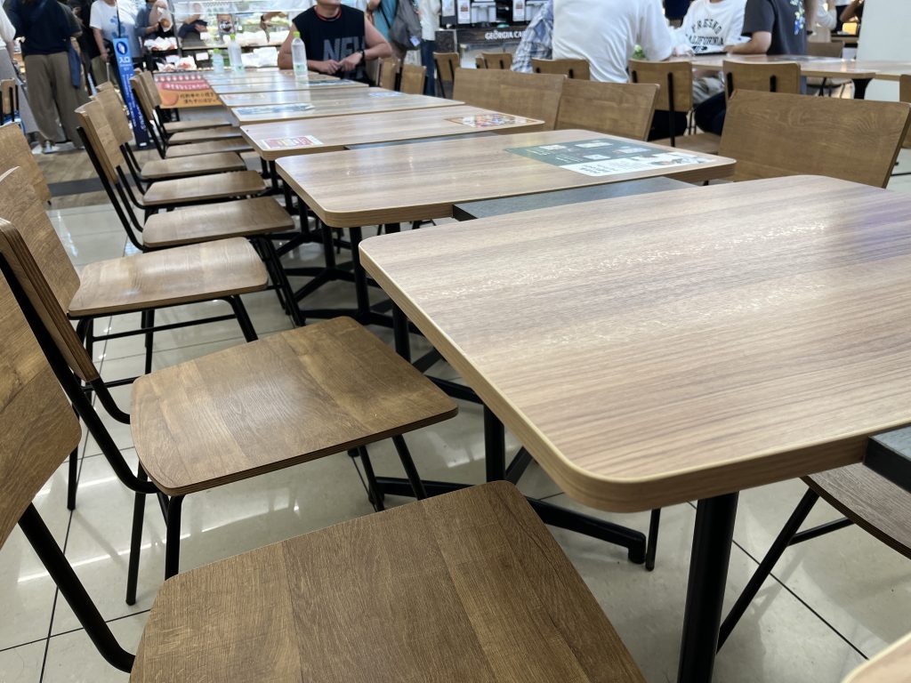 もっと進むと食品メインのお土産屋さんやフードコートがあります。この日は臨時の平台でシャインマスカットの催事販売がされており、購入したシャインマスカットを下げている方を多く見ました。