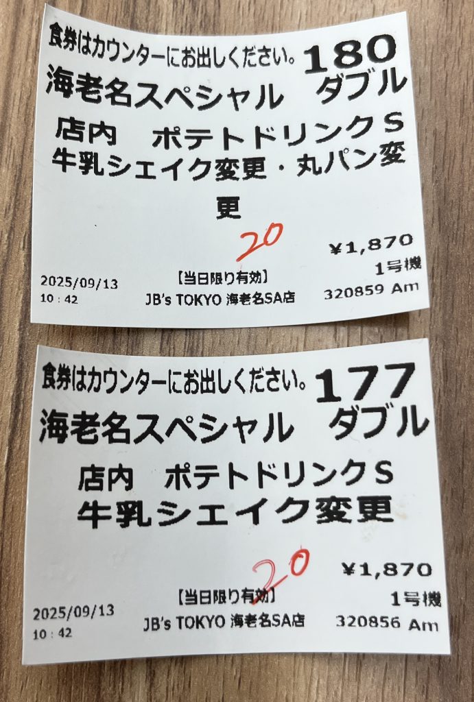 私はパテダブルでレタスとトマトの入った物が欲しかったのですが、どうしても購入出来ず、「海老名スペシャル ダブル」と言うのにして、要らないベーコンを抜いて(同行者にあげました。)希望内容のメニューにしました。