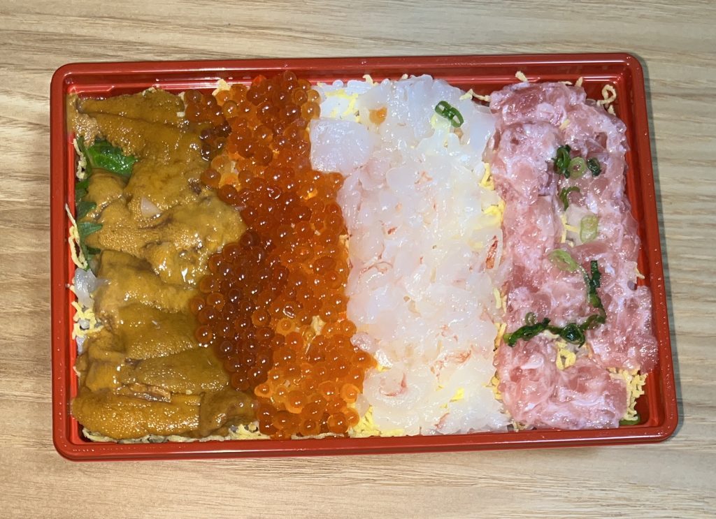 ウニ・いくら・海老(生)・ネギトロの四色丼が税込1200円です。