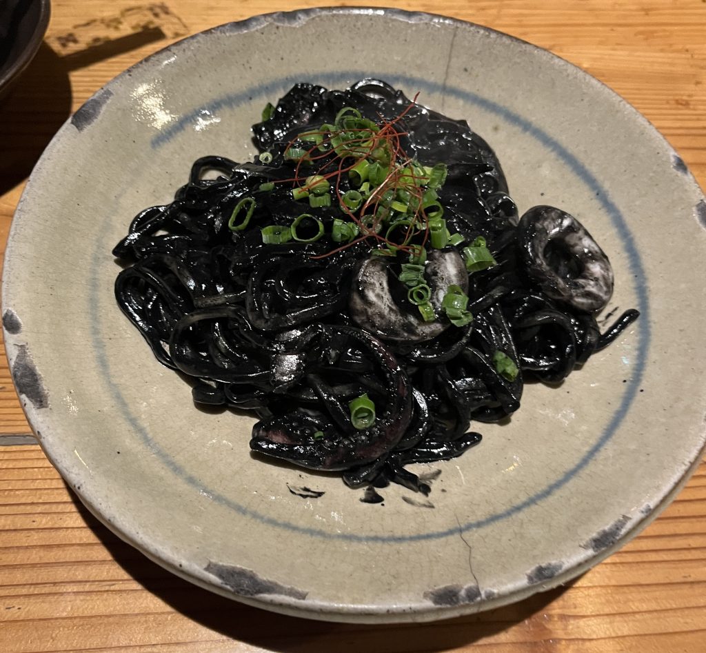 「出入口」に来ると決めてからオーダーが決まっていたメニュー。イカスミたっぷりですが、イカ自体、たっぷり入っていました。
