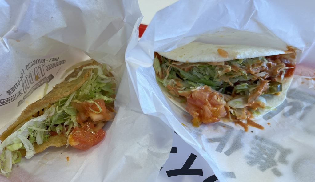 左 タコス 税込250円 右 ホットチキンタコス(ソフト) 税込380円
