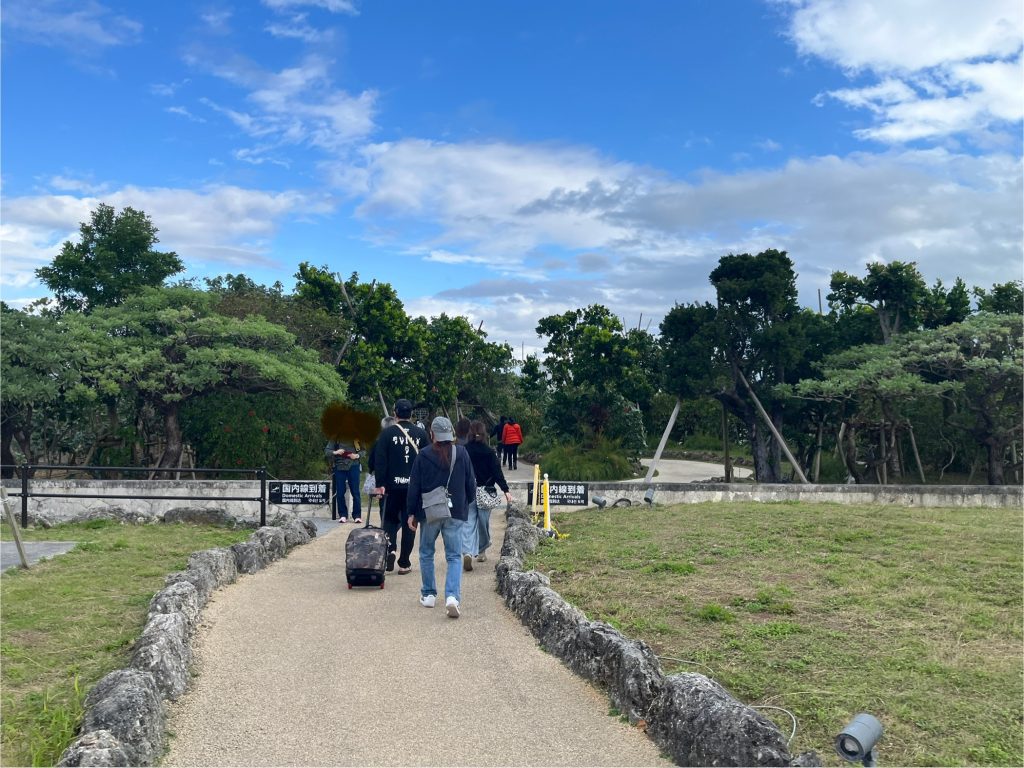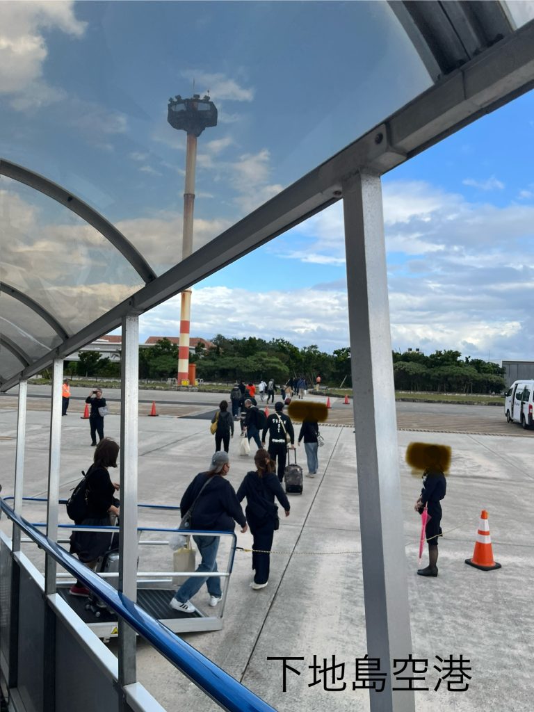 飛行機で到着したら、渡り廊下の様な簡易的な通路を使うかバスで行くかで空港建物に入る事が多いですが、下地島空港では飛行機から階段でそのまま下りて地上を歩き、空港の建物に向かいます。
