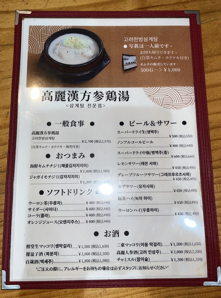 ドリンクとおつまみのチヂミはありますが、メインは高麗漢方参鶏湯のみです。