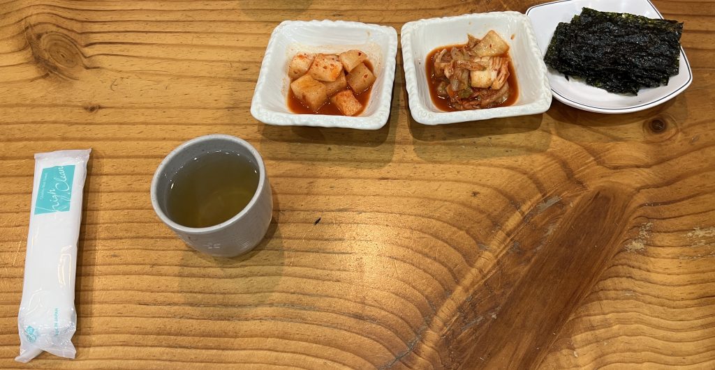 オーダーしたら白菜キムチ、カクテキ、韓国のりとお茶が運ばれました。
